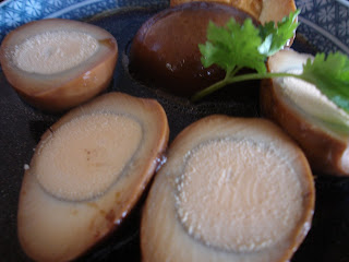 Soak the pig's trotters in ice cold water for 2 hours. Drain and put them in a large stockpot. Add enough water to completely cover and bring to a rapid boil over high heat. Boil for 5 minutes and skimming off the scums and impurities. Drain and rinse in cold water a couple of times. Return the trotters to the and add garlic, rice wine, salt and pepper. Cover with cold water and bring to boil again and skimming off any impurities. Reduce the heat to low and partially covered with a lid and simmer for 5 to 6 hours. Lift out the trotters and meat with a slotted spoon and transfer to cutting board. Collect the meat and discard the bones. Chop the meat into fine dices and set aside. Pour the stock through a strainer lined with cheesecloth into a bowl. Let cool and skim off any fat. Carefully pour the stock into a oblong cake tin 4 by 8 inchesand refrigerate. When the jelly is half set, scatter the diced meat and sliced egg on the surface and push them gently into the jelly. Sprincle the mushroom, peas and carrots between the meat and eggs. Cover and refrigerate overnight or until firm. To serve, cut into bite size square as an appertizer. To be continued.